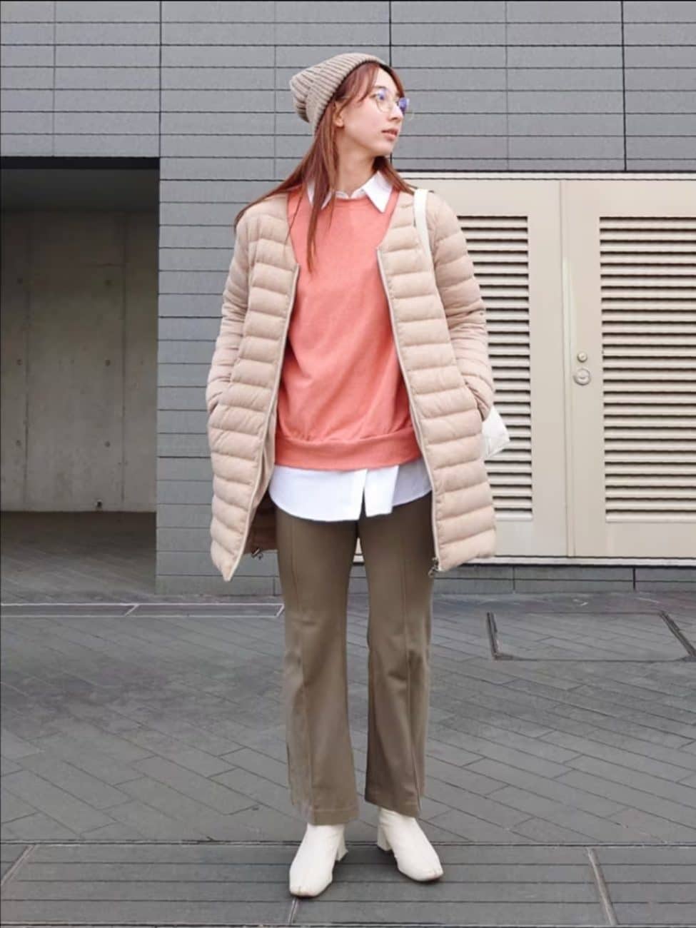 得意なカラーとはいえ、ポップな色味を多用すると幼い印象になってしまいます。メインとなる色を決め、その色に合わせてコーディネートを考えると大人っぽくまとまりやすいでしょう。今回は、ピンクオレンジのトップスをベースに、優しい色味でまとめています。