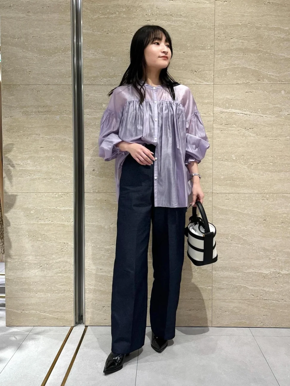 ブルベ夏タイプの方は寒色系が得意。ラベンダー色のブラウスと、ブルー系のデニム調パンツでまとめたコーディネートです。明るめのパステルカラーを暗めのベーシックカラーで引き締めると、カジュアルになりすぎず上品に仕上げられます。