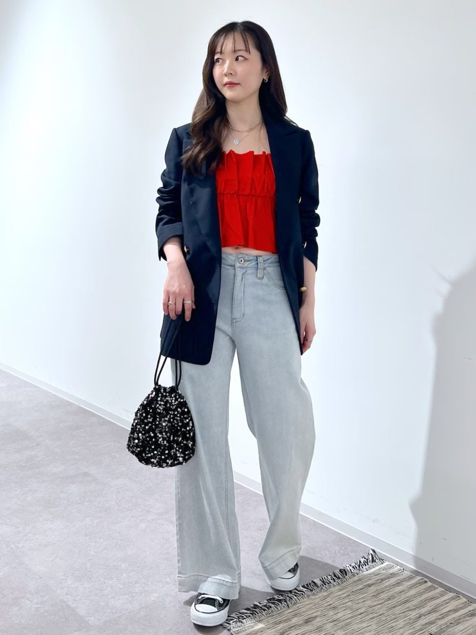 ブルベ冬タイプの方に似合うのは、鮮やかな原色系のカラー。ただし、鮮やかなカラーを多用するとごちゃごちゃした印象になるため、アクセントに使うのがコツです。こちらのコーディネートでは、シンプルなジャケット・デニム・スニーカーの組み合わせに、真っ赤なビスチェがアクセントになって一気に上級者風に。