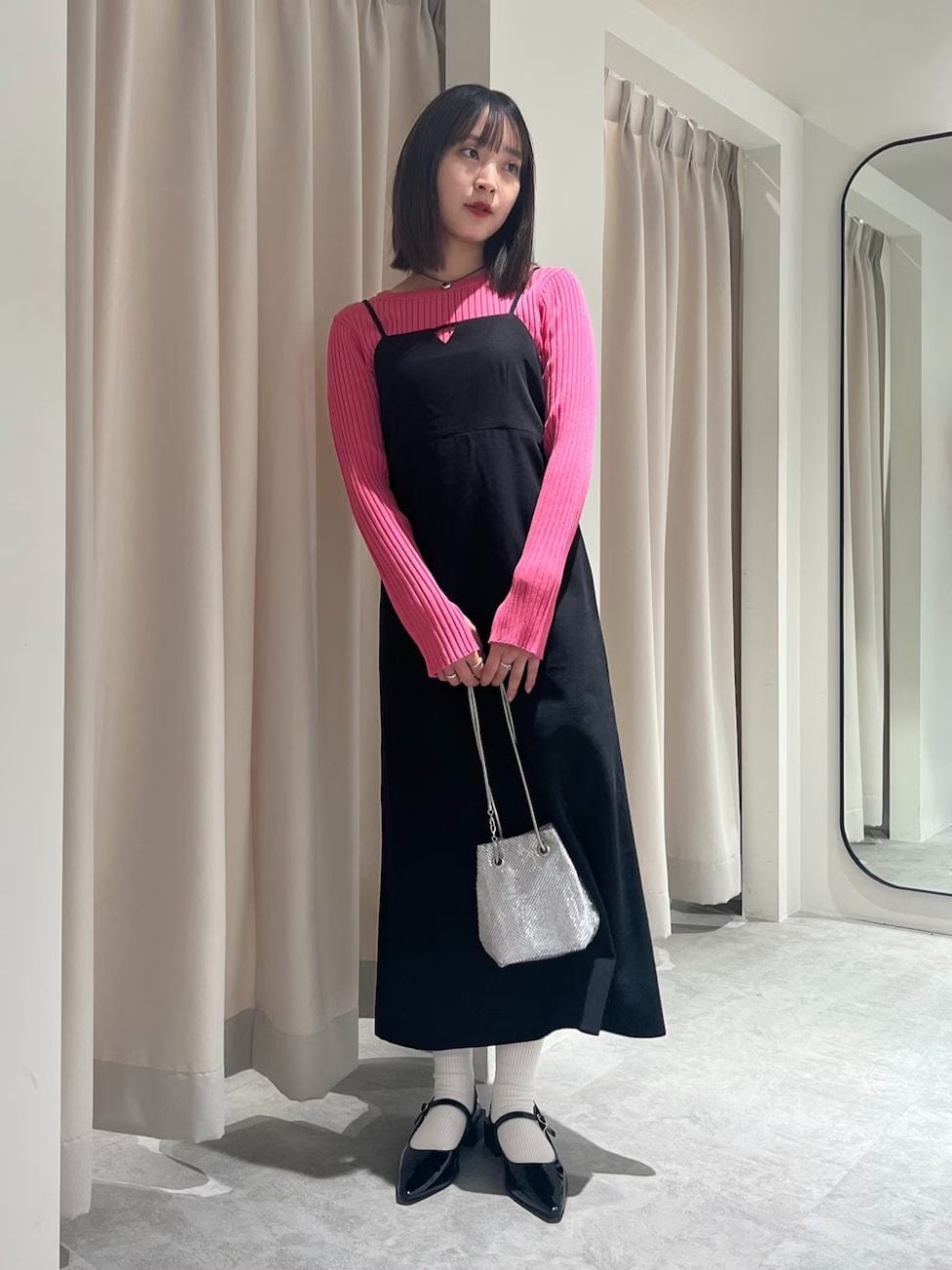 コントラストが強い配色が似合うのも、ブルベ冬タイプならでは。ビビッドなピンクのリブニットに、ブラックのキャミワンピースを合わせています。また、メタリックなシルバーも似合うので、コーディネートのワンポイントとして取り入れてみてください。