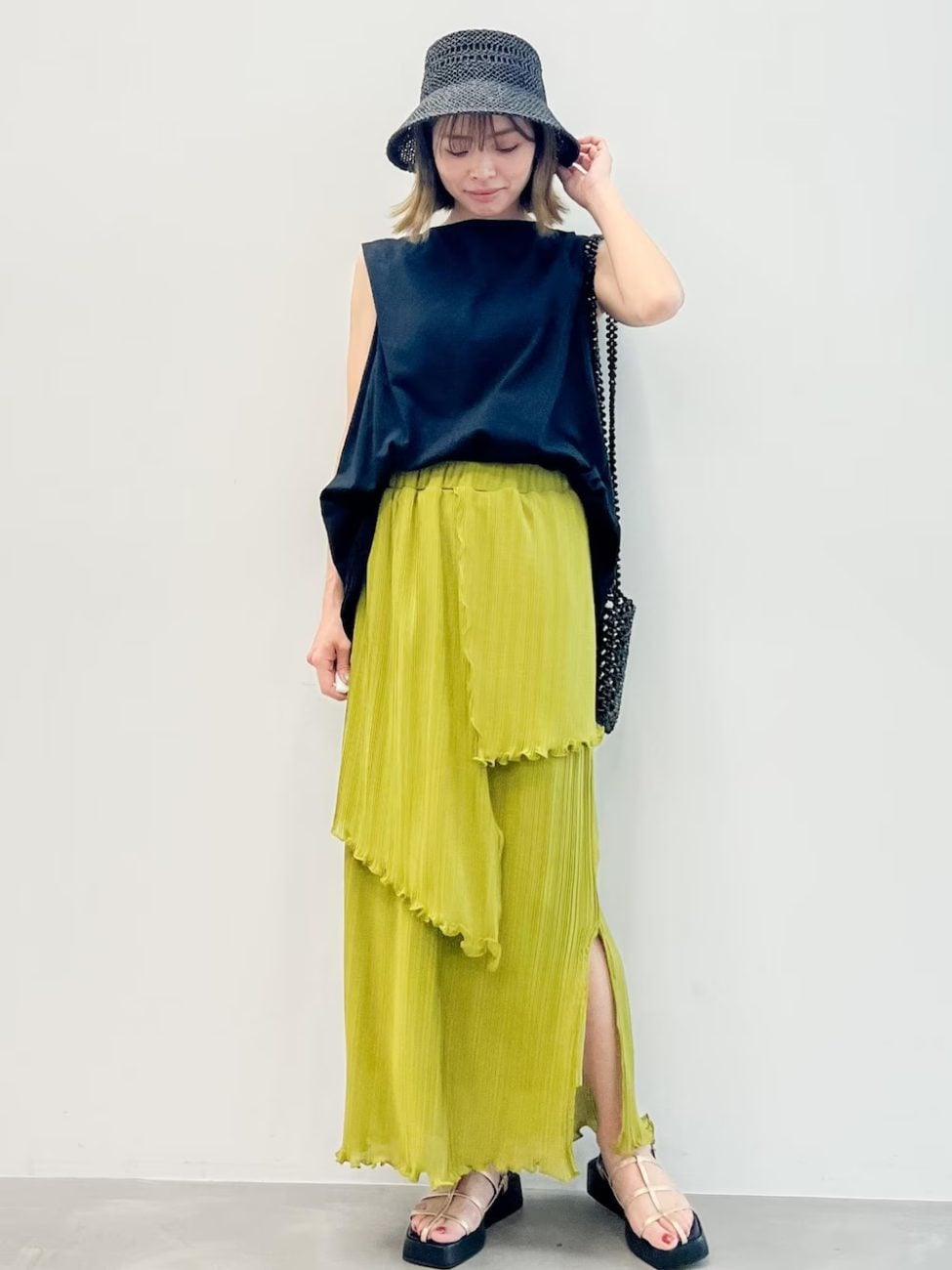 こちらのコーディネートでは、イエロー系のスカートをメインにしつつ、顔周りのトップスやハットはシンプルなブラックでまとめています。スカートは、アシンメトリーなティアードとスリットが入ったデザイン。色だけでなくデザインを強調すれば、「似合わない色」などの印象を軽減できます。