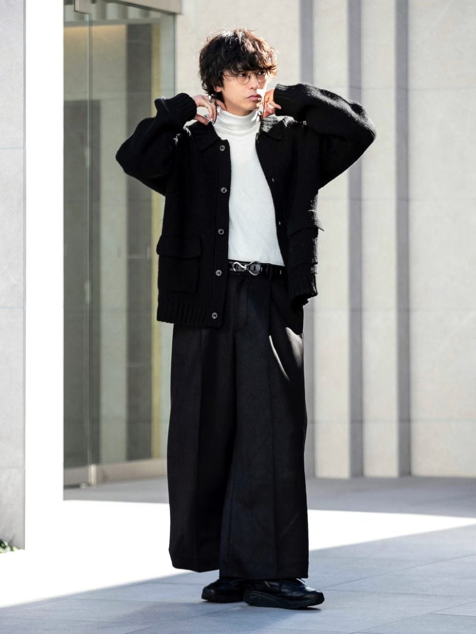 ブラックコーデの差し色として、白のタートルネックをインナーにプラス。薄手のタートルネックなら、ニットカーディガンと合わせても着膨れせず、シルエットを保てます。
