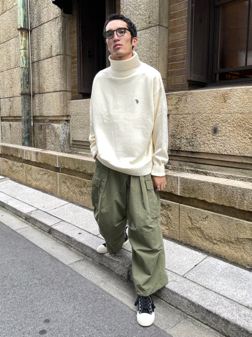 白タートルネック×カーゴパンツ