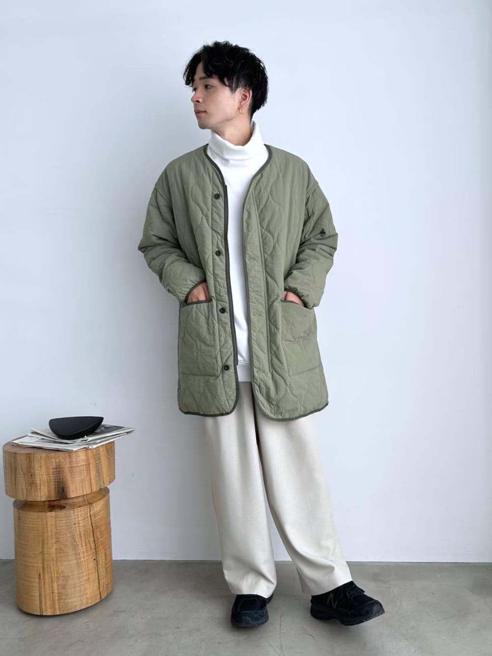 首周りが広めに開いたキルティングジャケットは、白のタートルネックを際立たせるのにぴったり。パンツも淡色系で合わせて、リラックスムード漂う休日コーデが完成します。