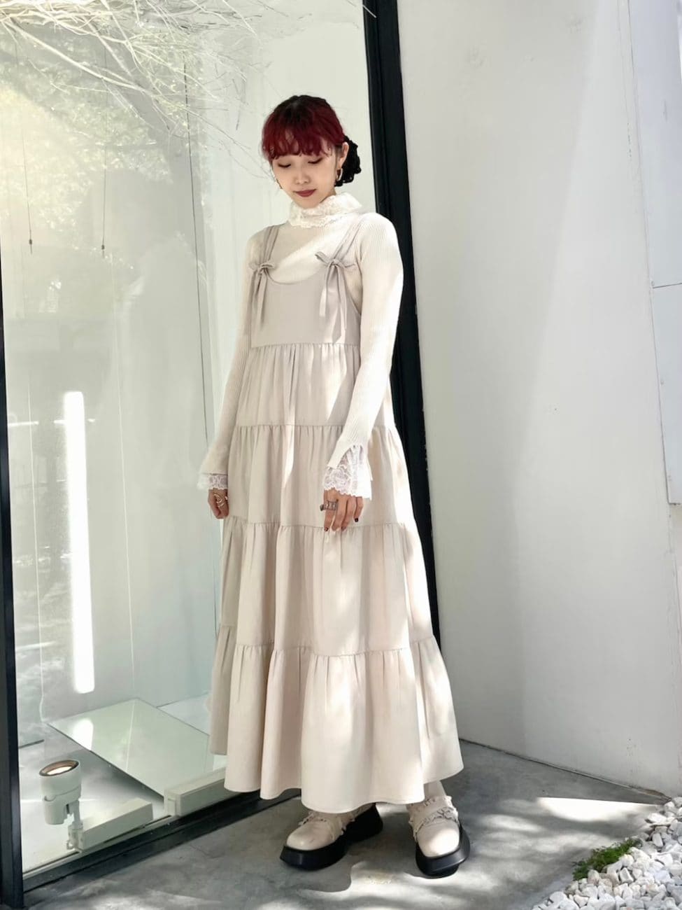 襟部分がレースになった白のタートルネックニットは、可愛らしいキャミワンピースとマッチ。デザイン性の高いタートルネックは、レイヤードしても存在感が残るのが魅力です。