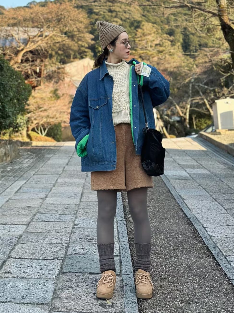 1月の外出時には、ボア素材のハーフパンツで動きやすさを重視。タイツやレッグウォーマーでしっかりと防寒すれば、冬でもハーフパンツを着こなせます。ニットキャップやハイネックのニットで、上半身の寒さ対策も忘れずに。