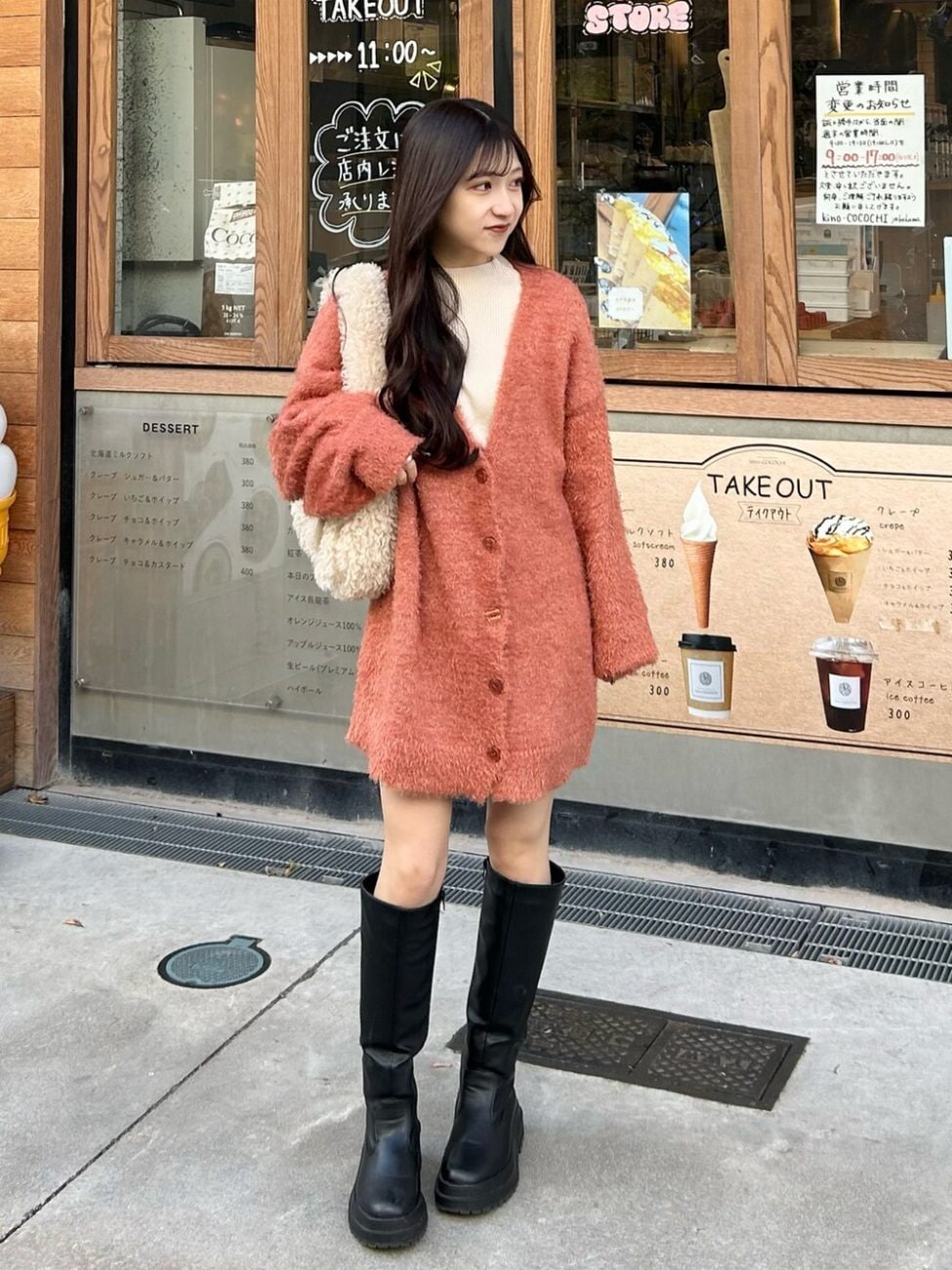 ミニ丈のワンピースに、オーバーサイズのオレンジ色のカーディガンを重ね着。厚底のロングブーツでコーデのバランスを取っています。モコモコとしたボア素材のショルダーバッグを持てば、可愛さがアップし、デートでも活躍する冬コーデの完成です。