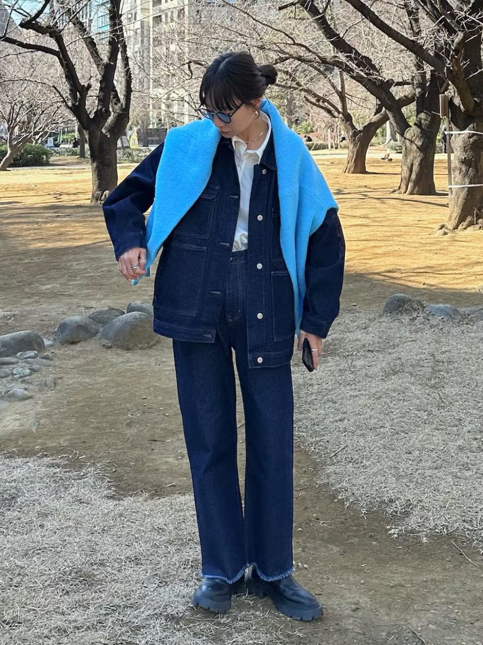 冬服がマンネリ化してきたら、春を意識した服装にするのもおすすめです。こちらのコーデでは、セットアップ対応のデニムジャケットとデニムパンツを着用しています。さらに差し色として、鮮やかなブルーのニットをプラス。暖かさも意識した明るい印象のコーデに仕上げています。