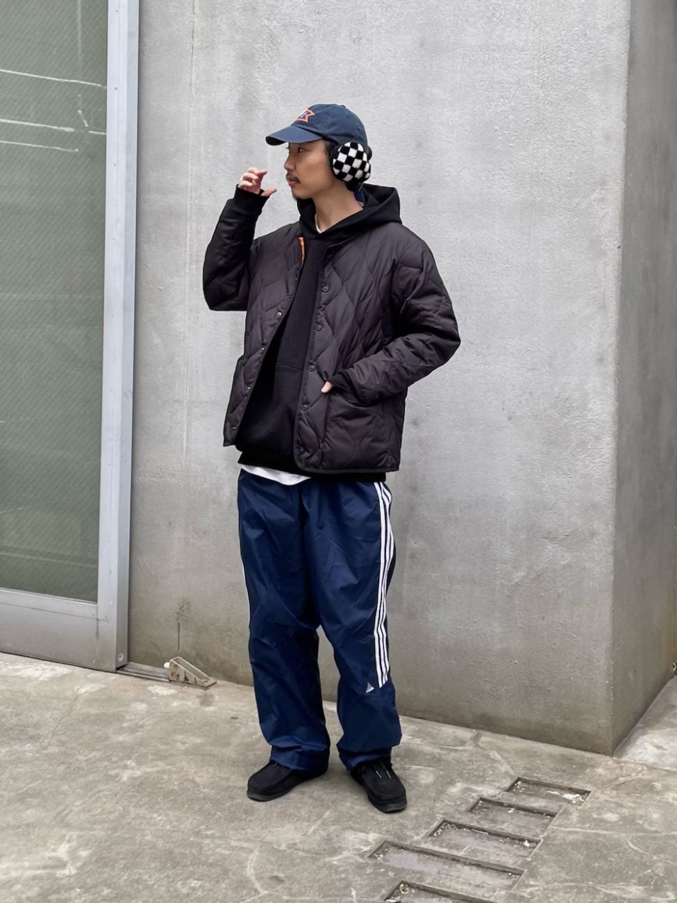 チェック柄のイヤーマフラーは、防寒具としてだけでなく、コーデのアクセントとしてもおすすめです。
