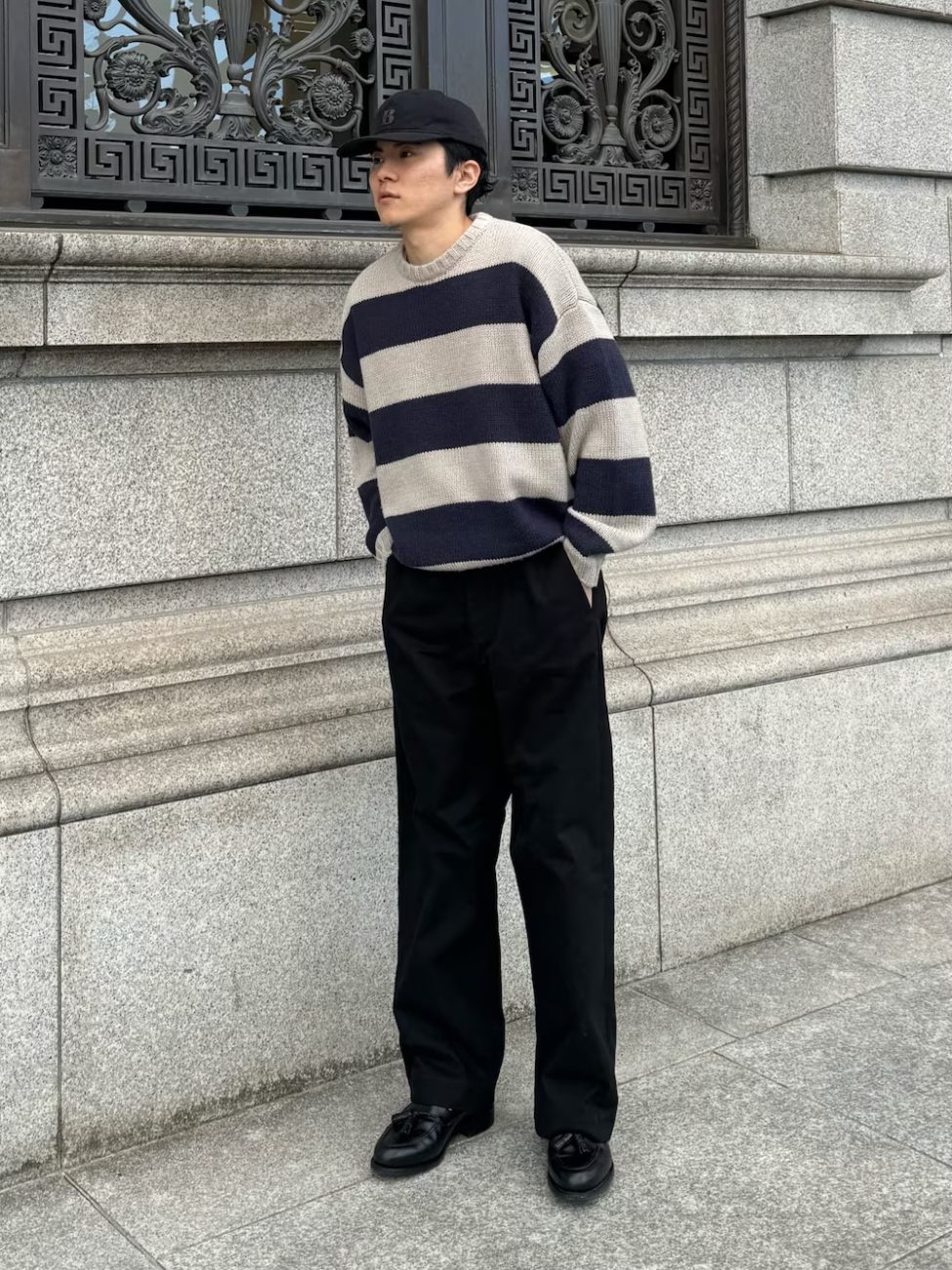 落ち着いた色味のボーダー柄ニットをメインにした、春まで着用できるきれいめカジュアルコーデ。足もとにはローファーを合わせて、きちんと感を出した服装に仕上げているのもポイントです。
