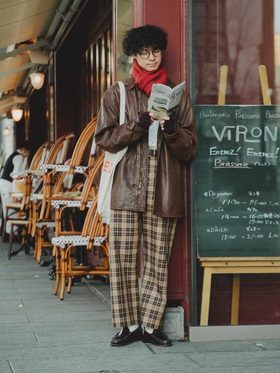 かっちりとしたレザージャケットを、個性派ながらも親しみやすいアイテムでカジュアルダウン。赤のウールスカーフやチェック柄のパンツを取り入れて、全体のバランスを整えています。ぬくもりを感じられるブラウンやベージュ系のコーデは、1月の服装にぴったりです。