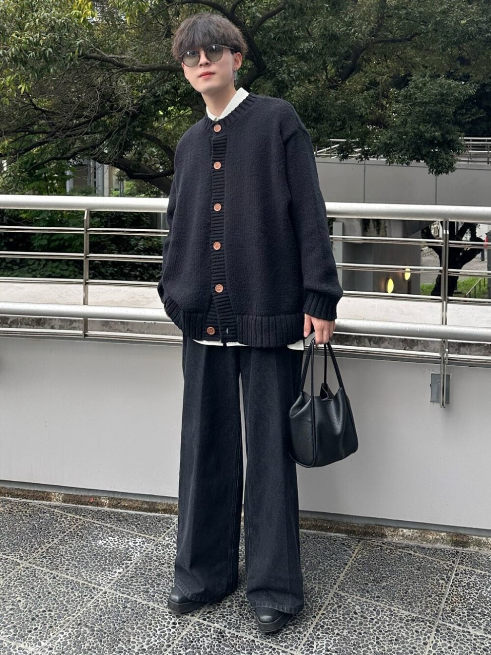 ブラック系のアイテムをベースにまとめつつ、ホワイト系のシャツをインナーに仕込んで抜け感を出しています。同じブラック系のアイテムでも、ニット素材・デニム素材・レザー素材と、異素材をミックスしているのがポイントです。