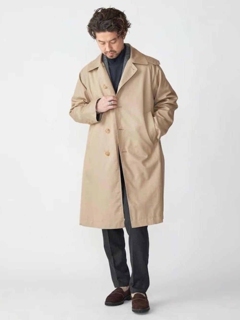 清潔感のあるコートを一枚持っておくと、オフィスカジュアルにも活躍します。細身のパンツと首周りに垂らしたマフラーで、Iラインが強調されてすっきりと見えるでしょう。幅広い年代の男性が真似したくなるコーデです。
