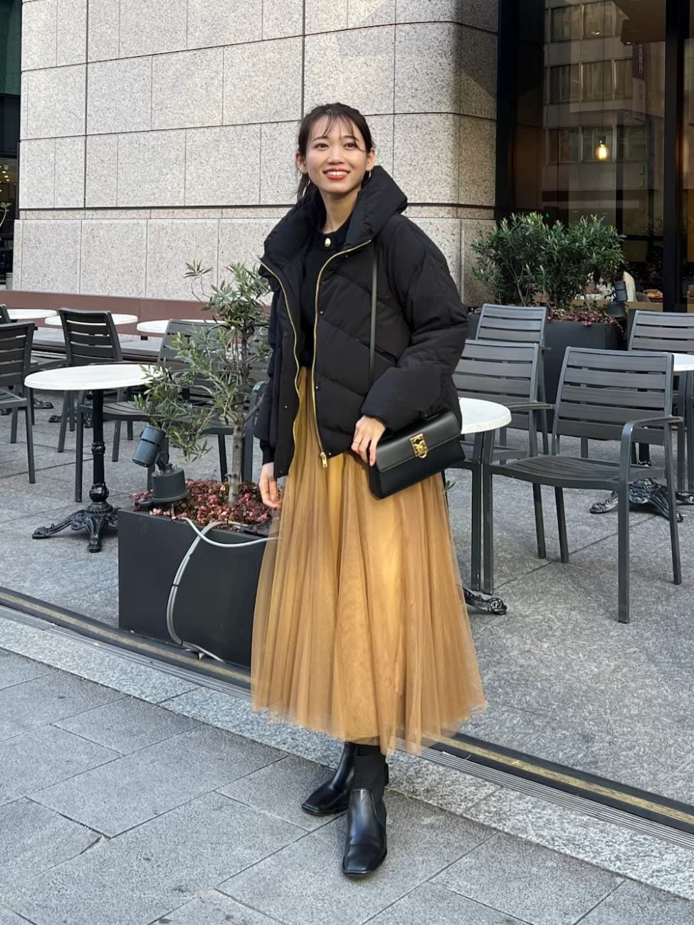 ボリューム感のあるショート丈のダウンジャケットに、女性らしいチュールスカートを合わせたコーデ。ダウンジャケットはネック部分にボリュームがあるため、防寒力もばっちりです。ふんわりとしたキャメル色のスカートによって、黒のダウンジャケットを軽やかに見せられます。