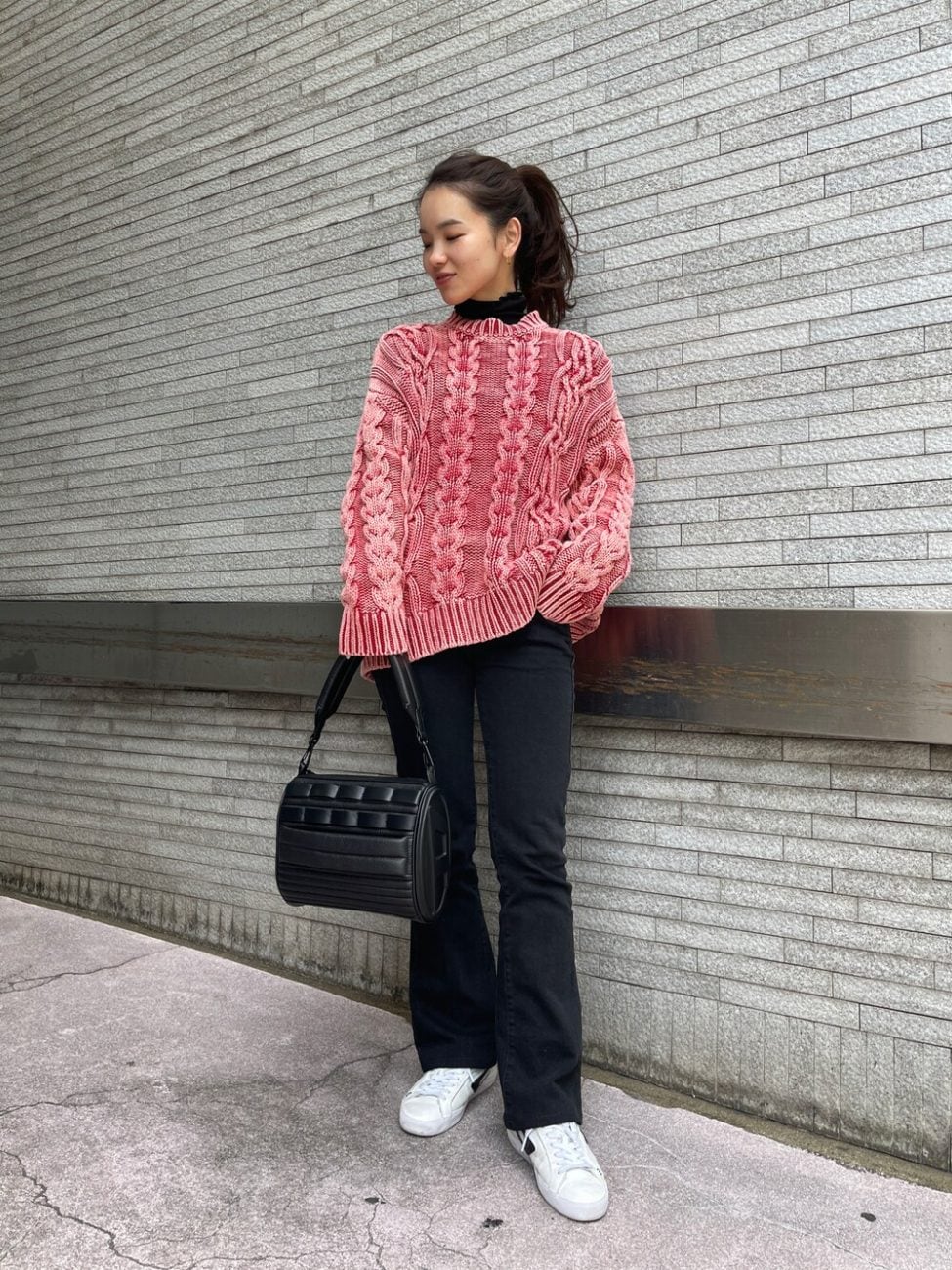 立体感のあるデザインのニットは、レッド系の華やかな色味でまさに主役級。ほかのアイテムはモノトーンでまとめて、コーデをすっきりと見せています。ニットに薄手のインナーをレイヤードして、暖かさをアップさせているのもポイントです。