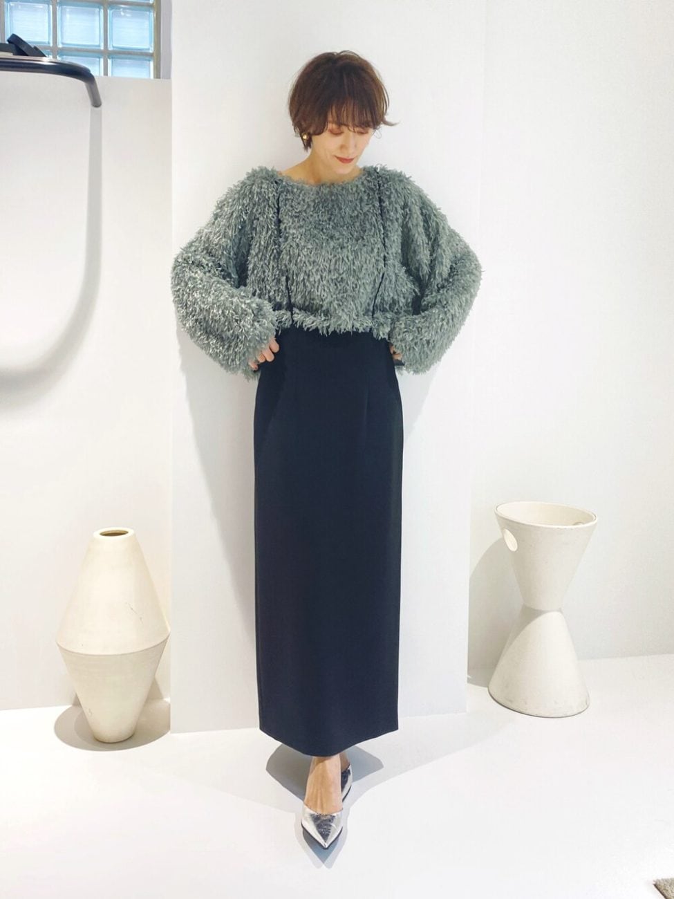 新年のイベント時は、首周りや足首など、適度な肌見せで抜け感を意識。フェザーの素材感が特徴的なプルオーバーは、一枚でおしゃれにきまるアイテムです。タイトスカートとポインテッドトゥのパンプスでレディにまとめましょう。