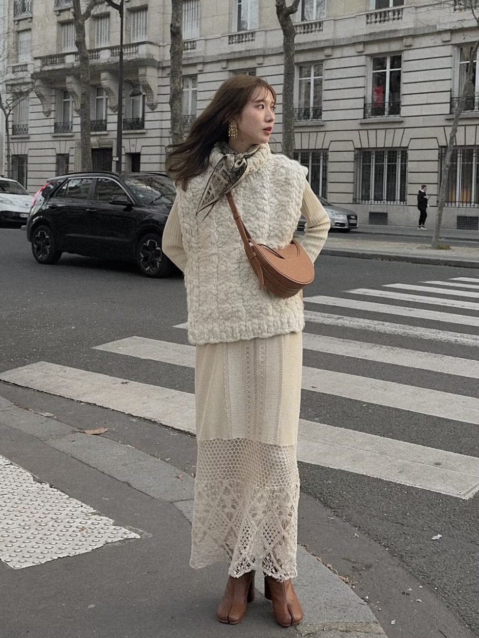 ホワイトとベージュ系の服装でまとめたフェミニンコーデ。ブーツはブラウン系を選ぶと、黒よりも優しい印象に仕上がります。トップスでネック部分の暖かさをキープできるなら、マフラーの代わりにスカーフを活用するのも◎。