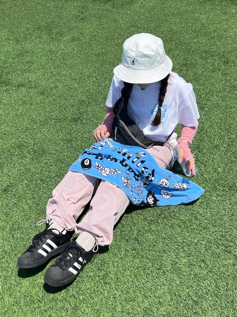 明るく爽やかな印象の白Tシャツに、フェミニンなカラーのカーゴパンツを合わせた女子フェスコーデ。バケットハットとアームカバーで夏の紫外線対策もばっちりです。全体的に白とピンクで統一しつつ、足元を黒のスニーカーで引き締めているのもポイント。