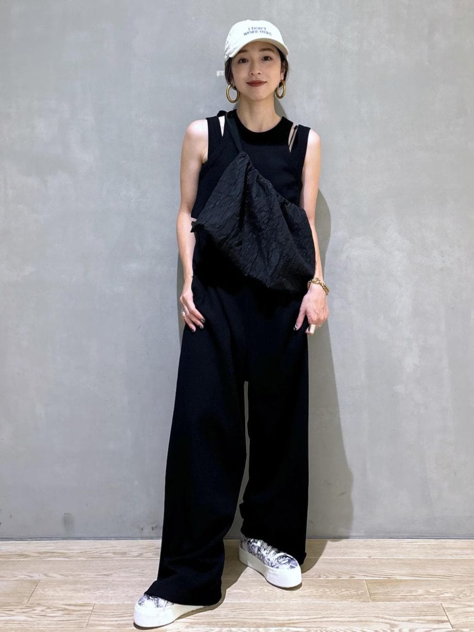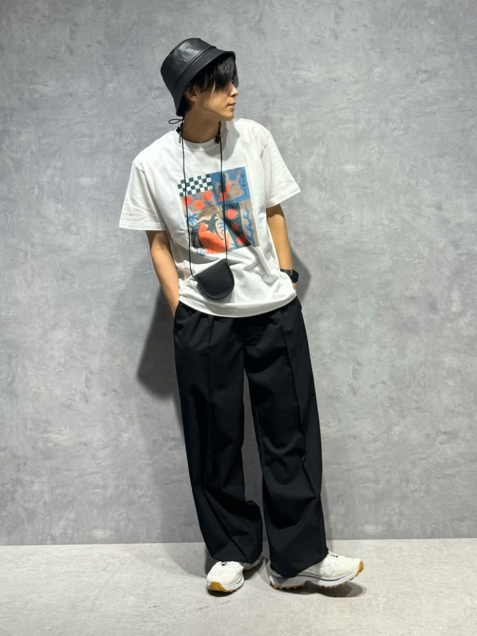 インパクトのあるイラストTシャツを、黒のバケットハットとフルレングスパンツできれいめにまとめたフェスコーデ。バケットハットの素材に合成皮革をチョイスしたことで、全体の雰囲気をワンランクアップさせています。足元の白スニーカーが、夏の気分にマッチ。