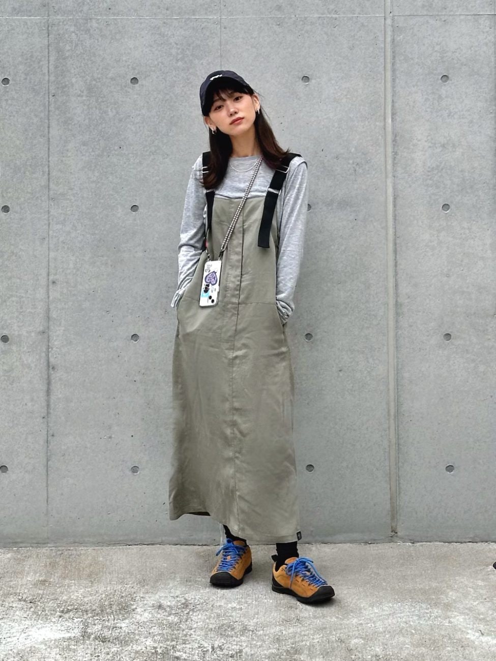 ロング丈のサロペットワンピースを、キャップとスニーカーでカジュアルに着こなしたフェスコーデ。アウトドアシューズは立ちっぱなしのフェスにもぴったりです。全体的にアースカラーでまとめている中で、靴紐の鮮やかな配色が◎。