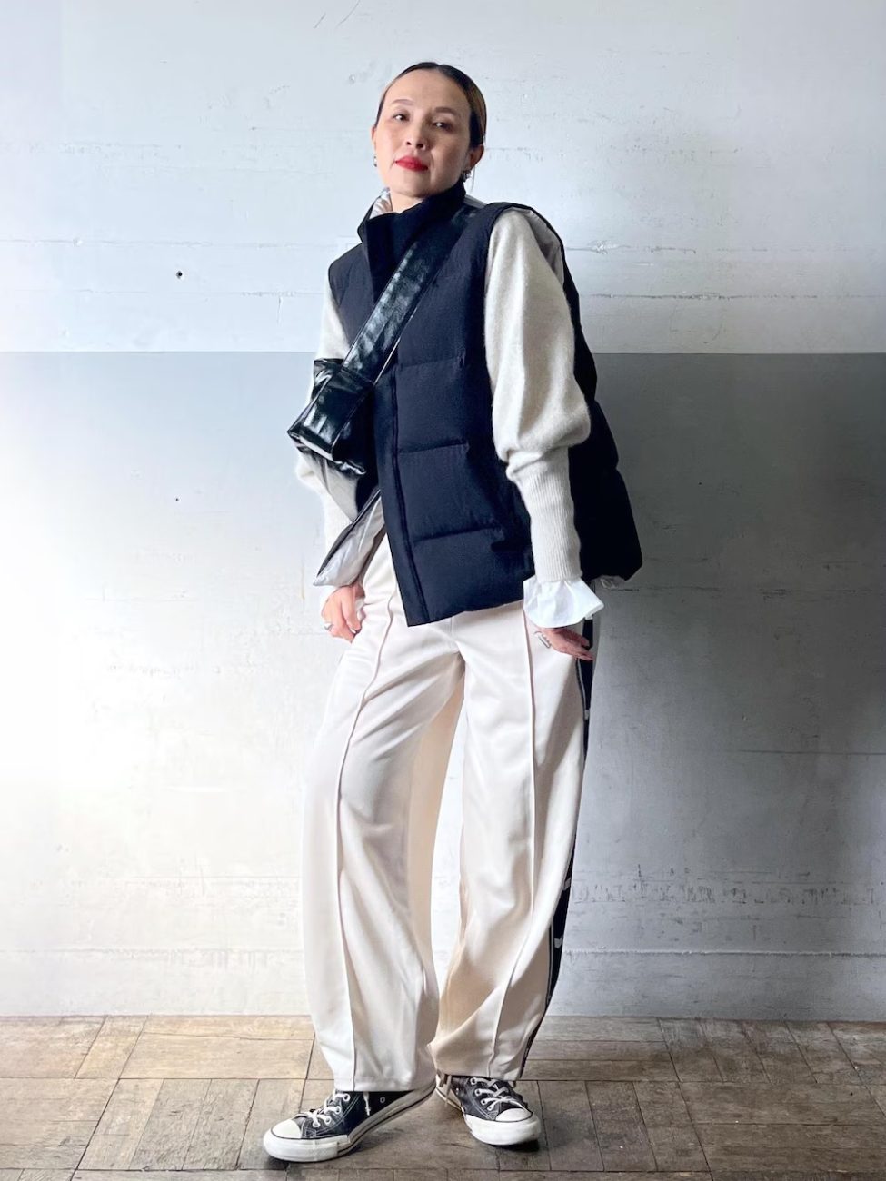 トラックパンツにダウンベストを合わせて、冬フェスにぴったりのコーデに。カジュアルすぎるコーデが得意でないなら、Tシャツやスウェットの代わりにニットを取り入れるのもありです。ニットの袖はフェミニンな印象ですが、ほかのアイテムとの組み合わせで絶妙なスポーティーテイストに仕上げています。