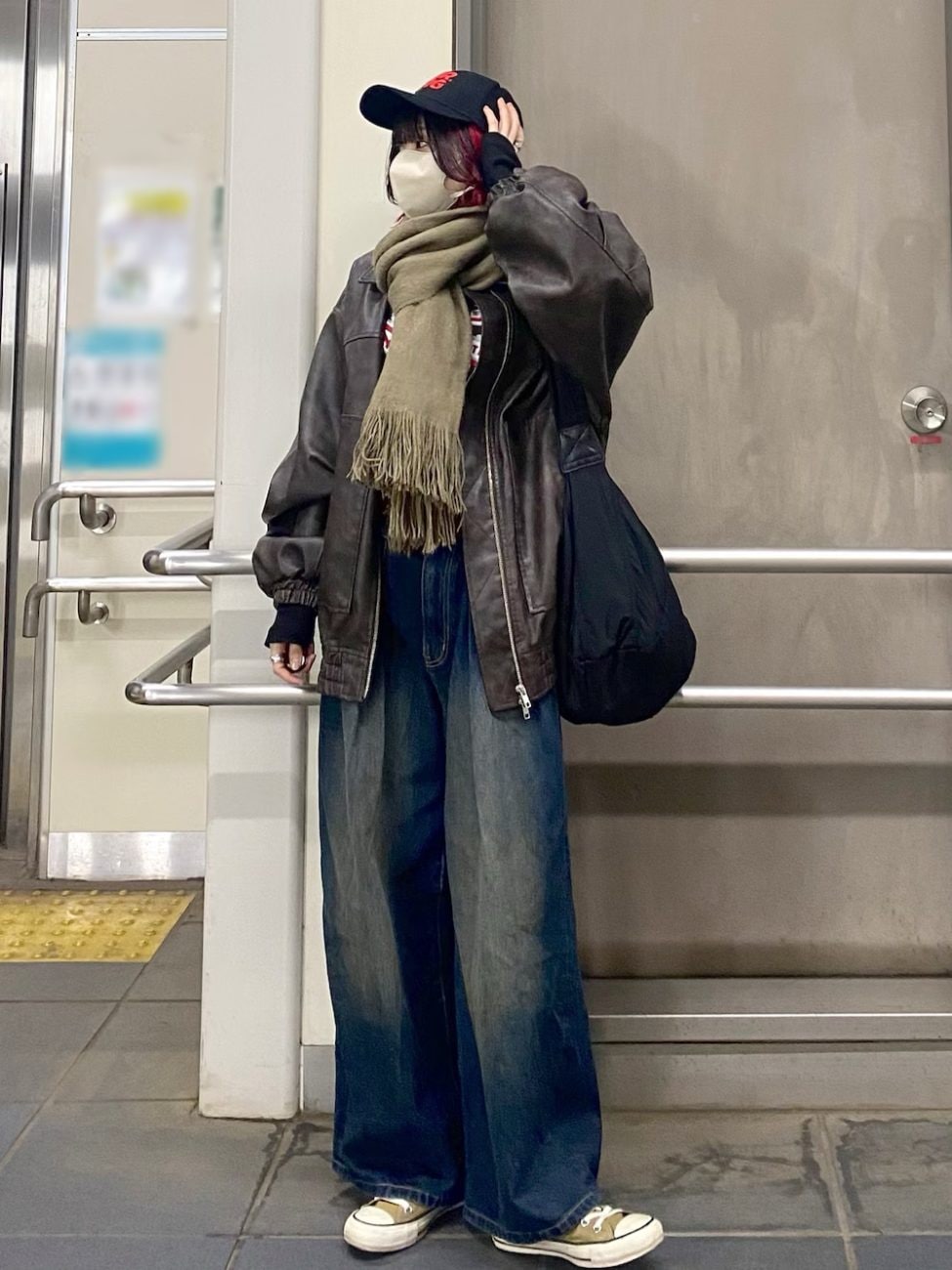 ヴィンテージ感のあるアウターは、ウォッシュド加工を施したフェイクレザーブルゾンです。ボトムスには同じくヴィンテージライクなタックデニムパンツを合わせて。アウターはゆったりシルエットなので、極寒の日は厚手トップスを着こめるのがうれしいポイントです。