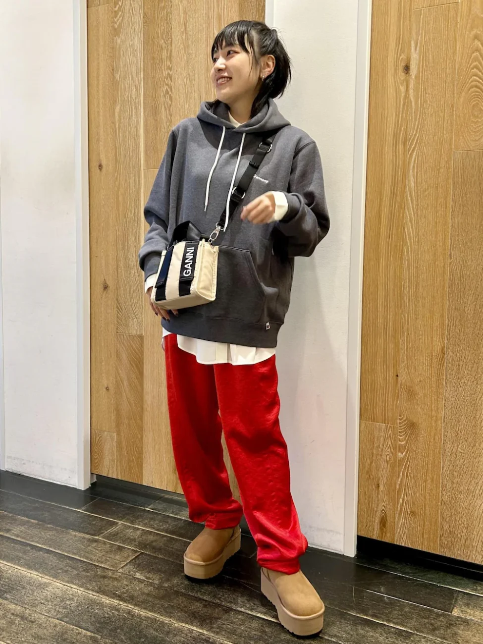 一見ラフでリラックスした雰囲気ながら、細部にこだわりが見える冬のスポーティーコーデです。長時間のフェスでも動きやすいイージーパンツはサテン素材で、女性らしいシルエット。パーカーの袖や裾、襟元に白シャツをのぞかせて抜け感をプラスしています。