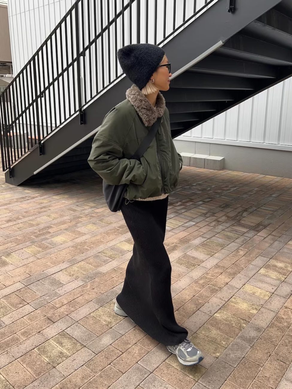 すっきりしたIラインシルエットのスカートにショート丈アウターを合わせて、スタイルアップ効果抜群。体のラインを拾いすぎないリブニットスカートなら、女性らしさと動きやすさの両方を叶えてくれます。足元はニューバランスのスニーカーをチョイスして、フェスコーデらしくスポーティーに引き締めて。