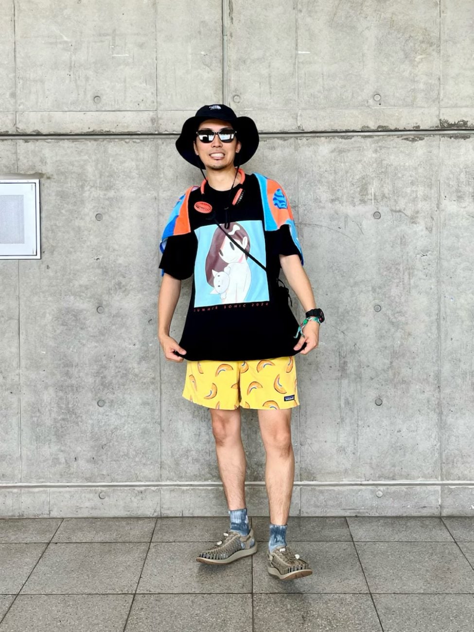 Tシャツ×ショートパンツにハットと、まさにお手本の夏フェスコーデ。〈patagonia パタゴニア〉のショートパンツは水陸両用で速乾性もあり、夏の暑さや突然の雨にも対応します。フェスに着るなら、派手めのプリントで気分を盛り上げてくれるデザインがおすすめ!