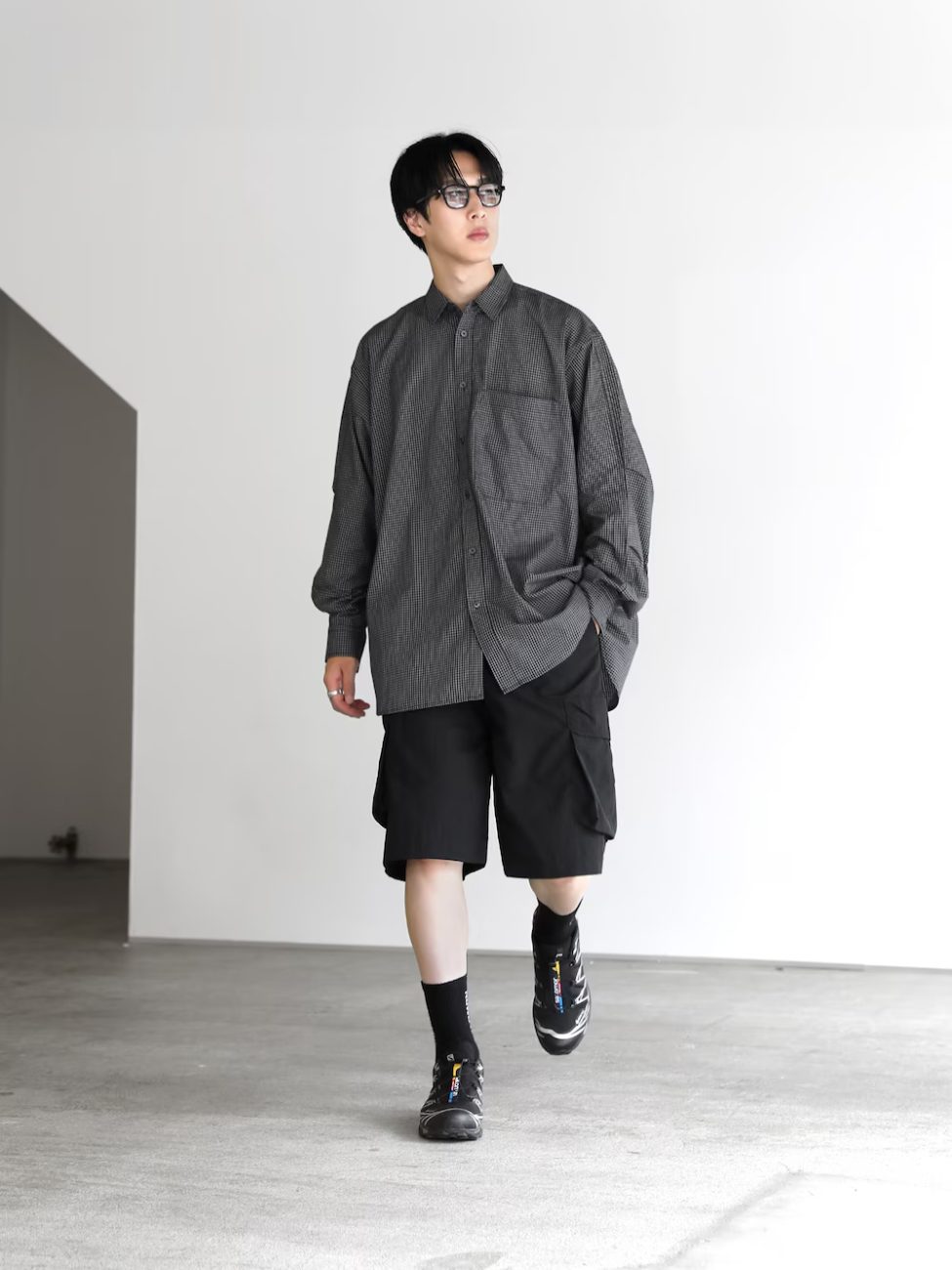 カーゴショートパンツはナイロン100%の軽やかさで、夏フェスとの相性も◎。ゆったり抜け感のあるシルエットのショートパンツに、オーバーサイズのシャツを合わせて落ち着いたテイストに。紫外線対策には長袖シャツのレイヤードも有効です。
