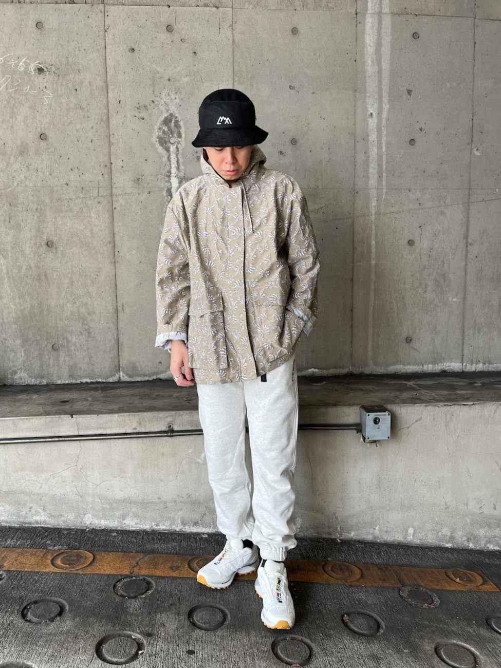 リーフ柄が入ったベージュのマウンテンパーカーで、映えるフェスコーデに。ライトグレーのスウェットパンツと合わせて淡色でまとめれば、春らしさもアップします。