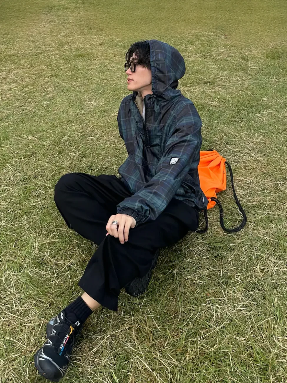 薄手のアノラックパーカーが1枚あれば、春・秋フェスでの防寒は安心。チェック柄がほどよく都会的な雰囲気を演出しています。ドレープ感の美しいイージースラックスが洗練された印象ながら、〈SALOMON サロモン〉のシューズで野外フェス仕様に。