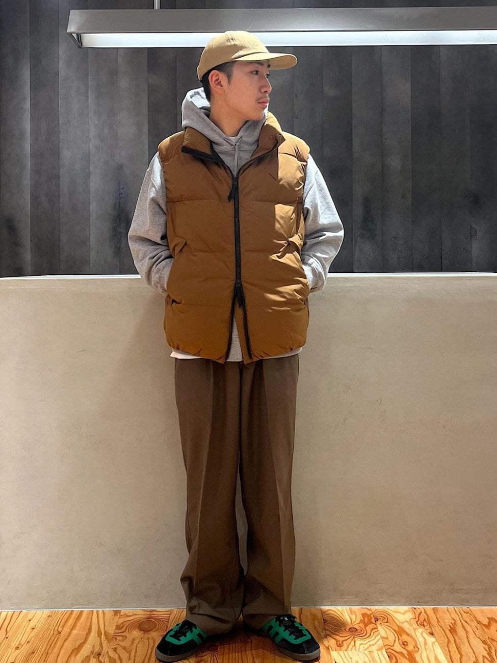 インナーはフーディーでカジュアルに、アウターはダウンベストで暖かさを確保しつつ、動きやすさも考慮。パンツはゆったりシルエットでリラックス感があり、長時間の冬フェスでも快適です。全体を落ち着いたトーンでまとめ、都会的なアウトドアコーデに仕上げています。