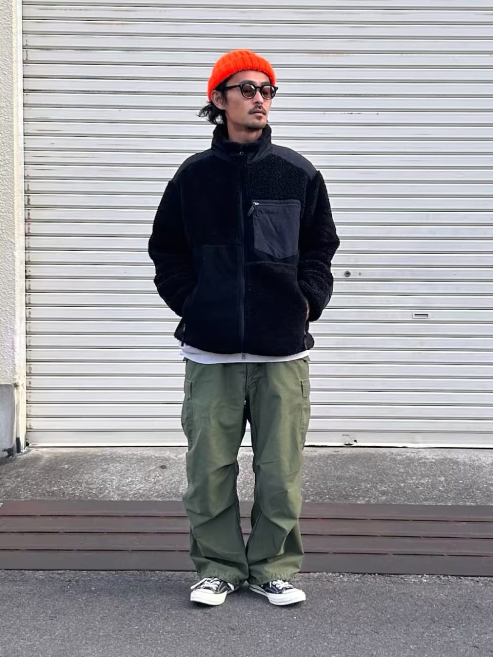 ボアフリースジャケットは防寒性が高く、軽量で動きやすいのでフェスにぴったり。カーゴパンツはゆとりがあるシルエットで、アクティブな動きにも対応します。オレンジのニット帽をチョイスして、スタイルに個性を加えているのも◎。