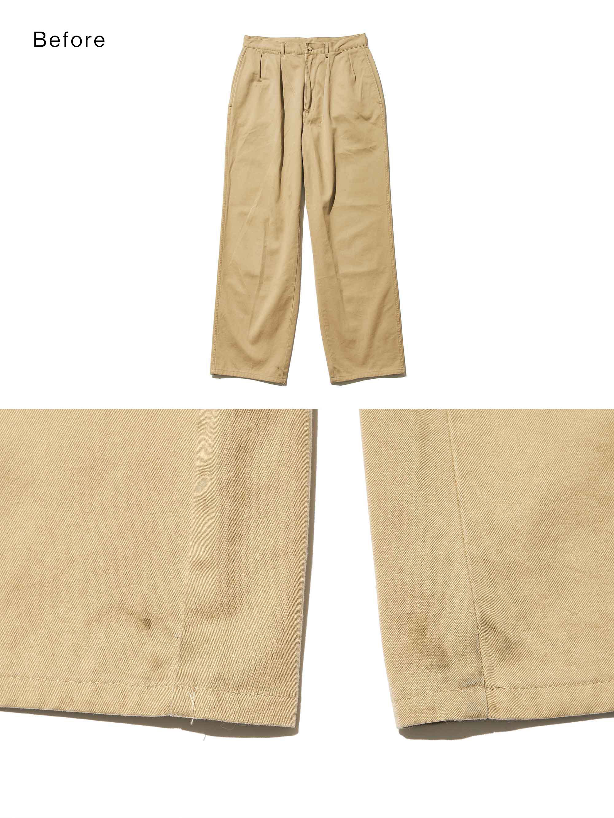 ラストは「チノパンツ」。自転車に乗った際にチェーンで擦った汚れだろうか。デニムパンツやミリタリーパンツと違ってカーキ色は 汚れが目立ちやすく、トラッドな印象のあるボトムスの品格を損なわせる。だがコレも染め替えれば…。