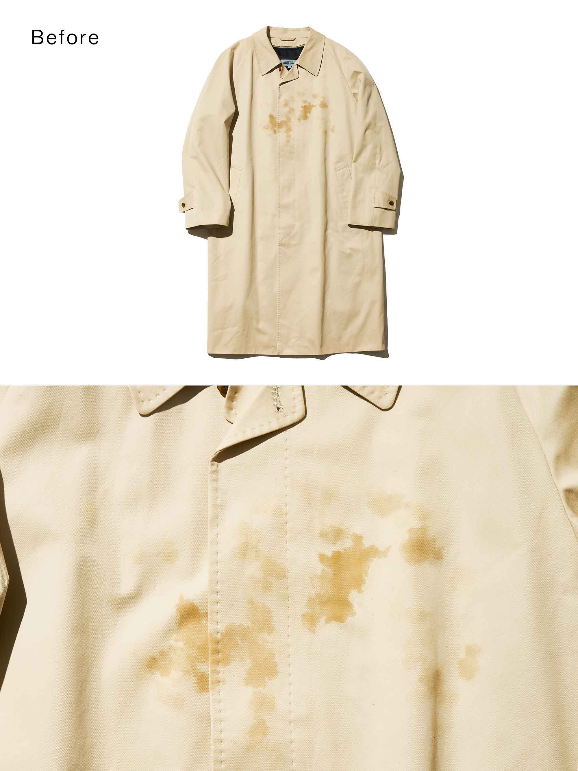 汚れてしまうとなかなかリカバリーできないアウターの中でも、ベージュカラーの「コート」は最難関。付着してしまったコーヒー汚 れは通常の方法では落としづらく、こうなってしまっては捨てるしかない…が一縷の望みを託してみた。